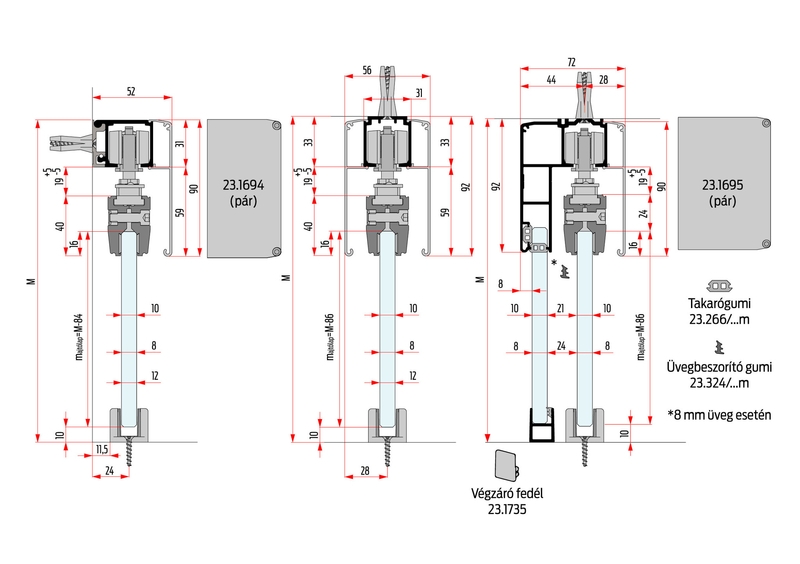 Választható profil felületek sín: natúr alumínium, eloxált alumínium, eloxált fekete